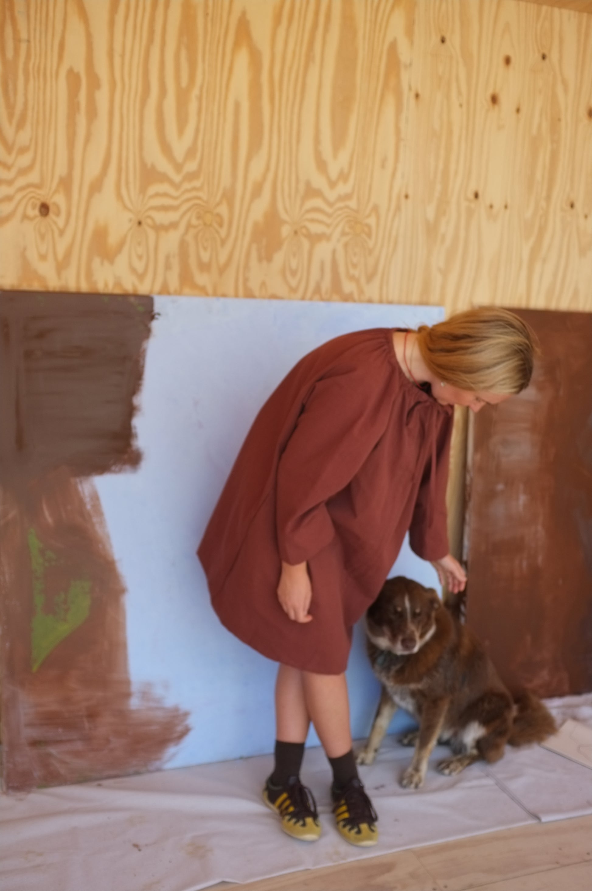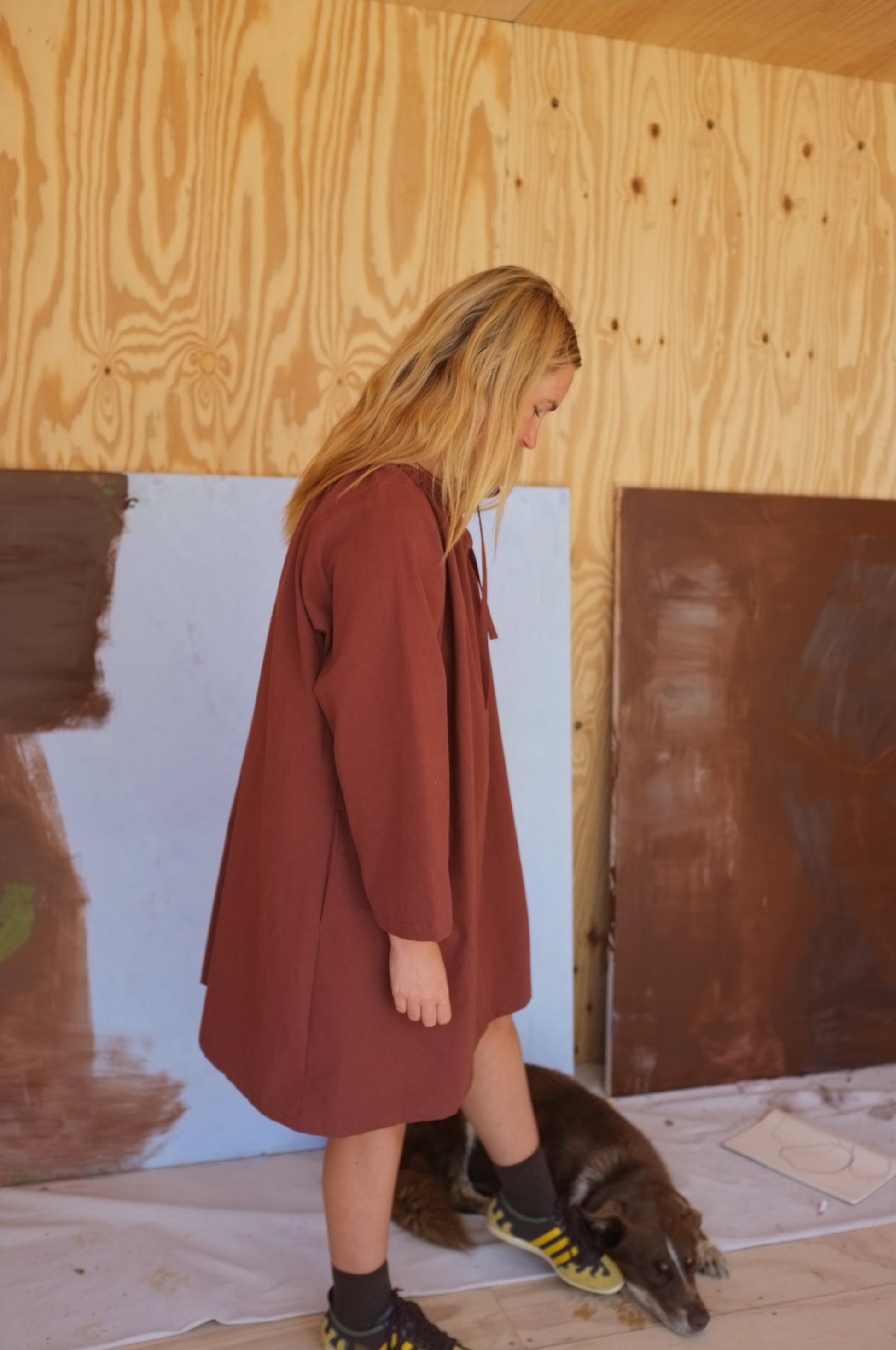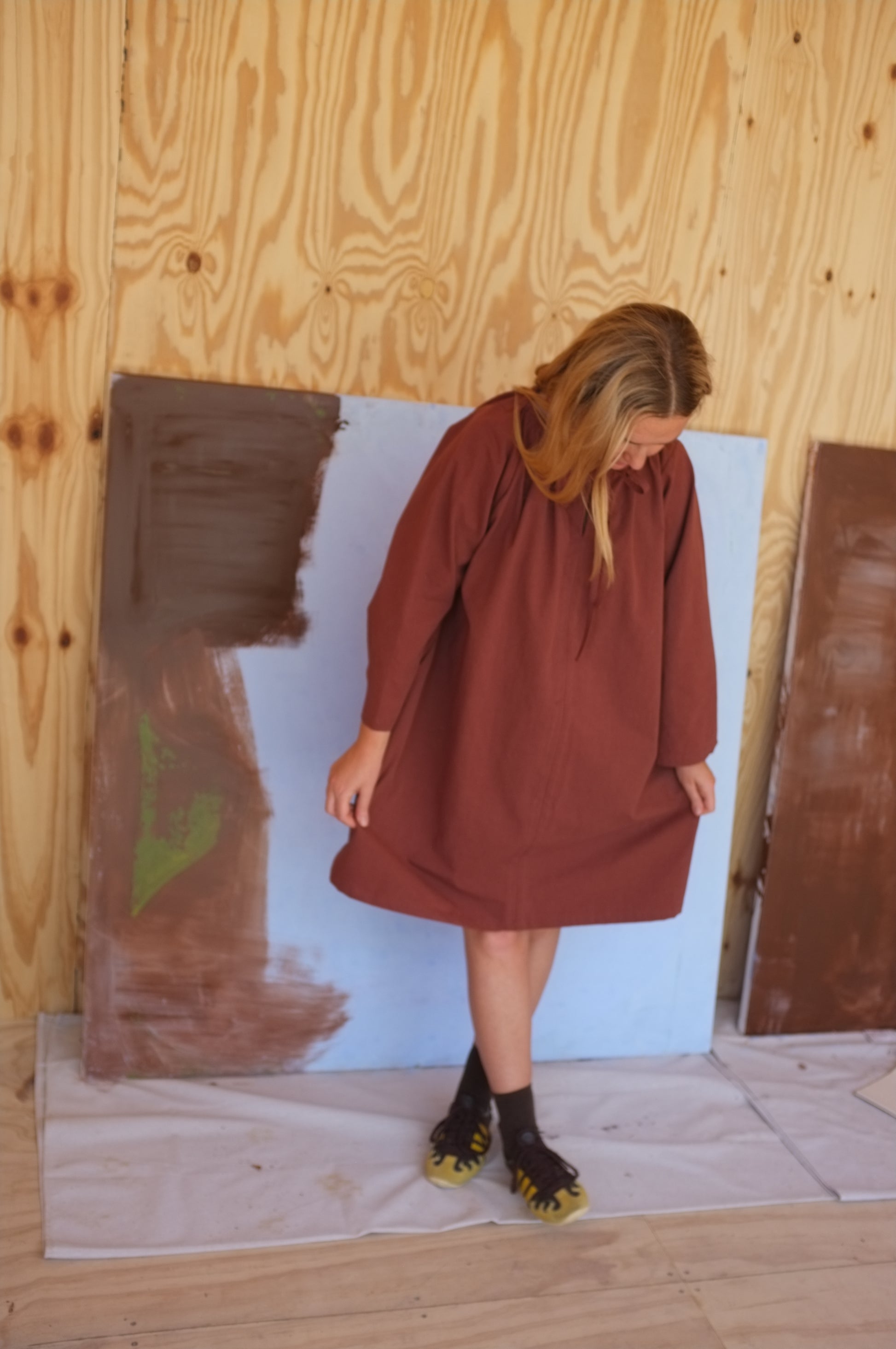 This dress has been designed, pattern made, cut and sewn by Mimi Holvast in Australia, with solar panels powering all machinery.