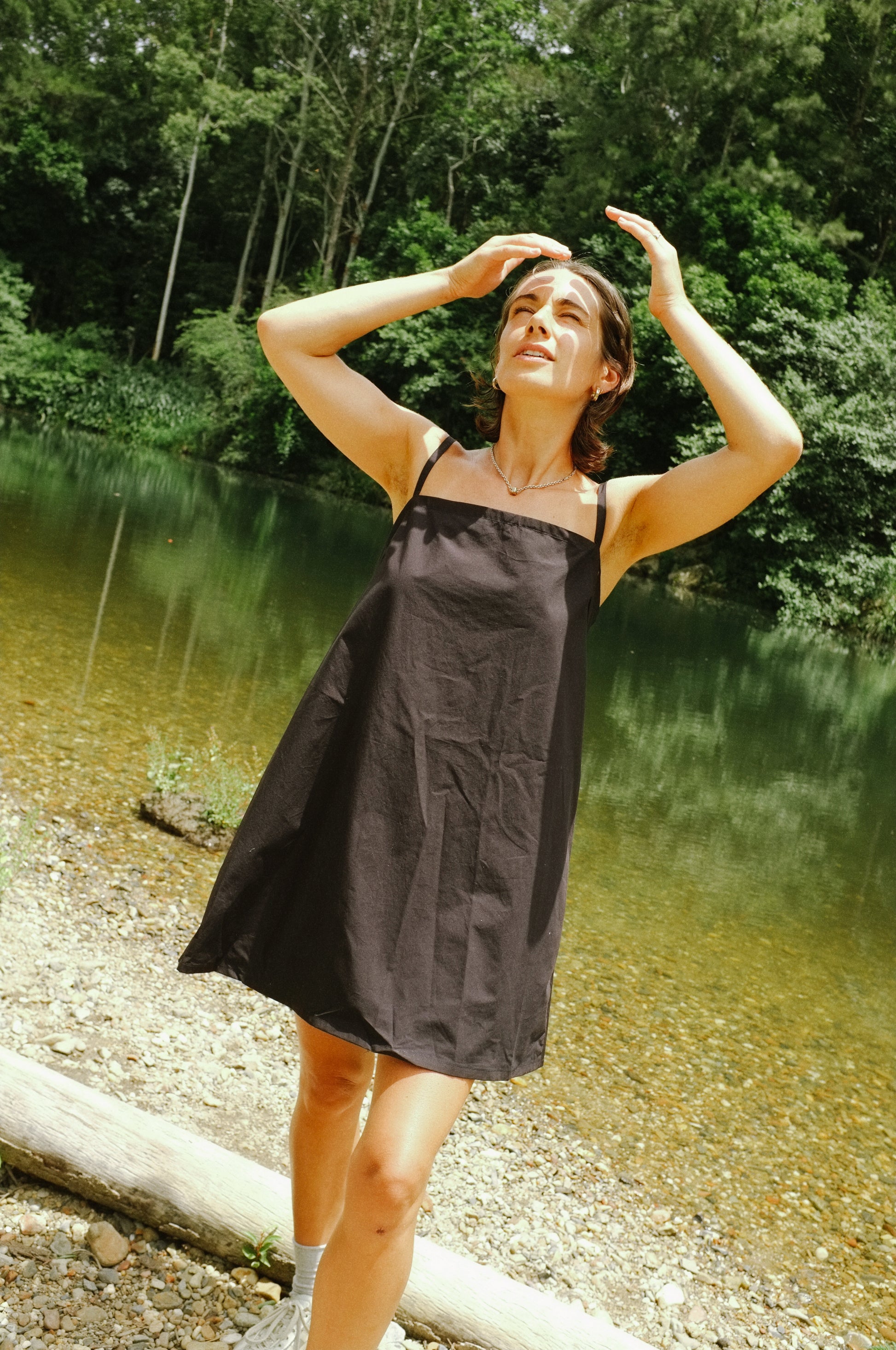 Short a-line mini shift dress with ties for straps and waist ties to cinch in the dress. Classic square MH neckline and adjustable straps and inseam pockets.